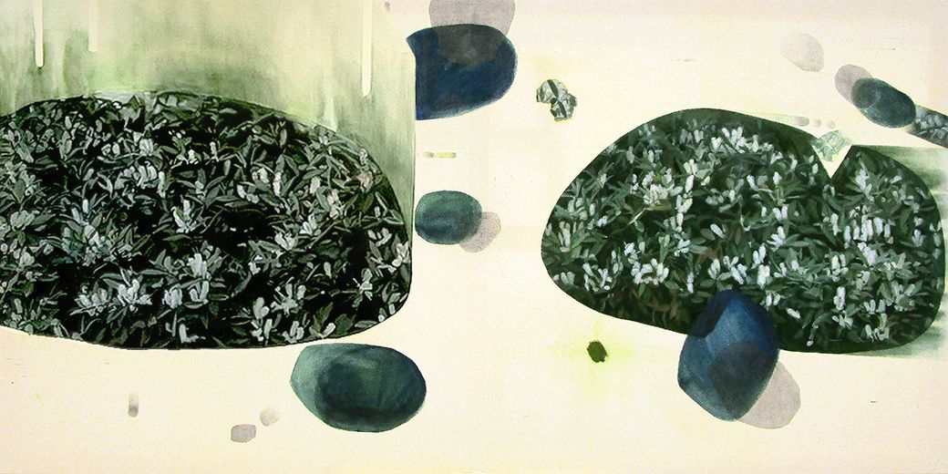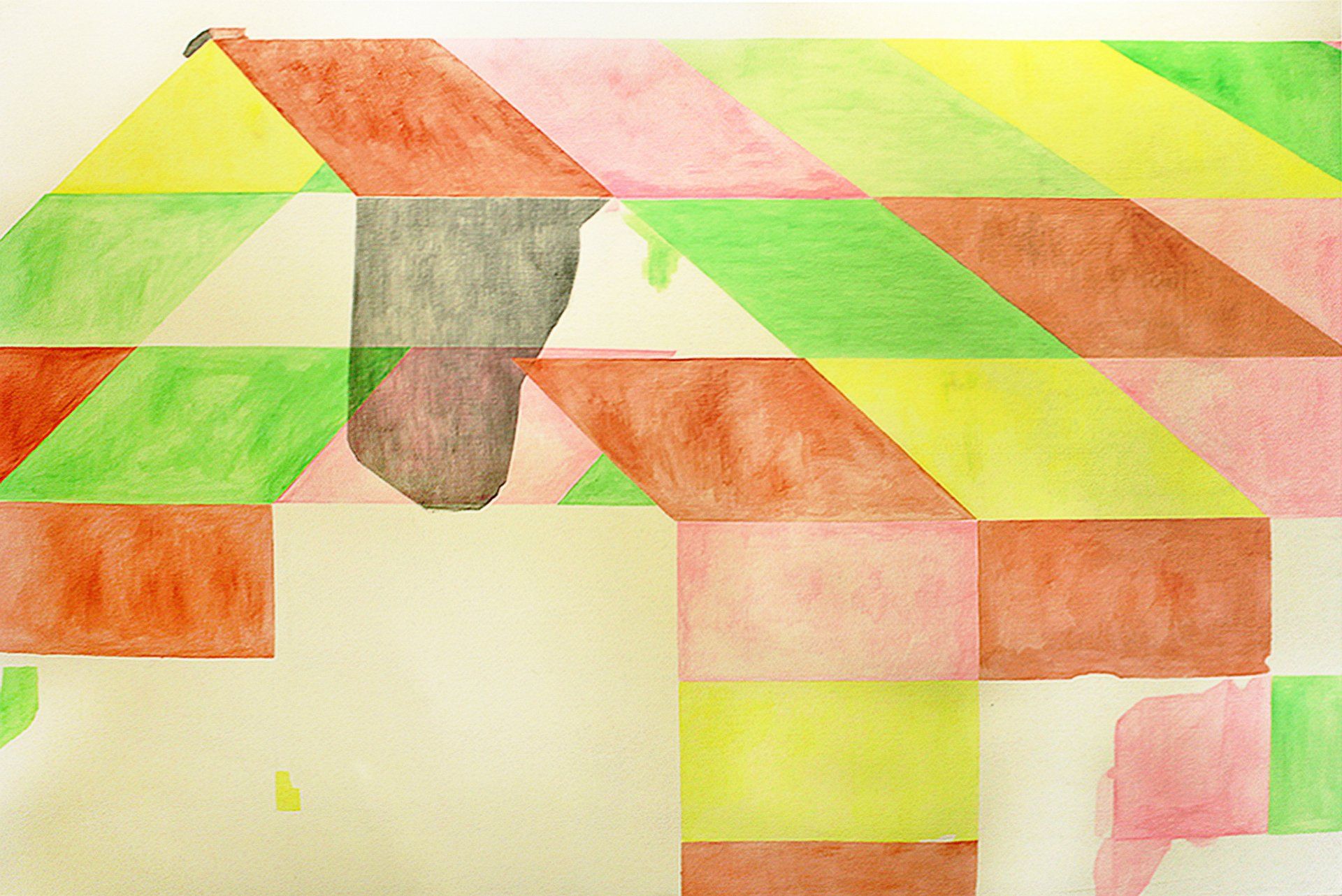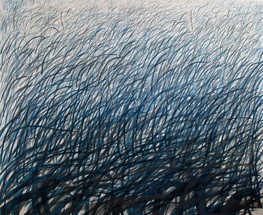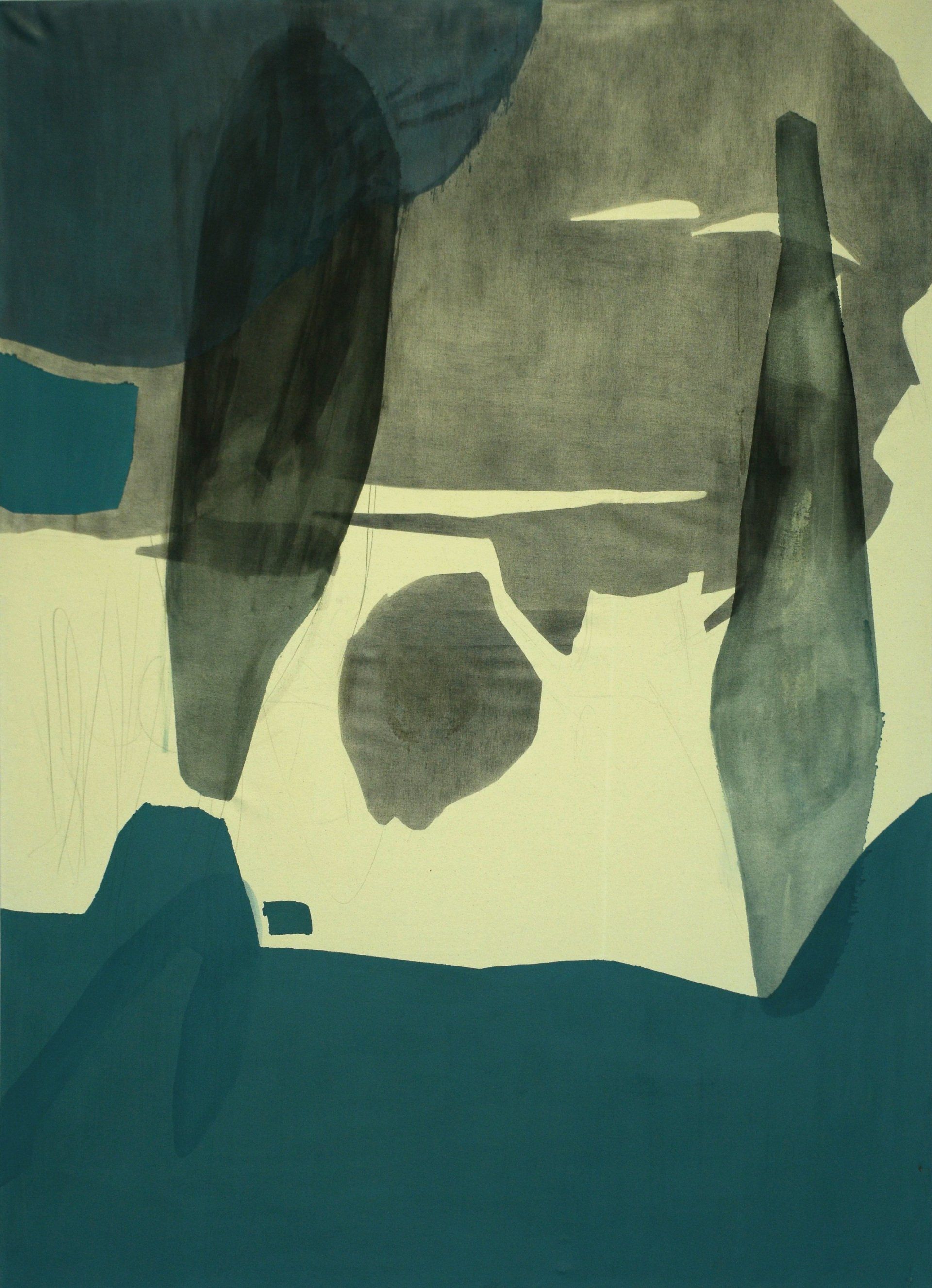 Acryl und mit Bleistift eingedrückte Konturen auf Leinwand,